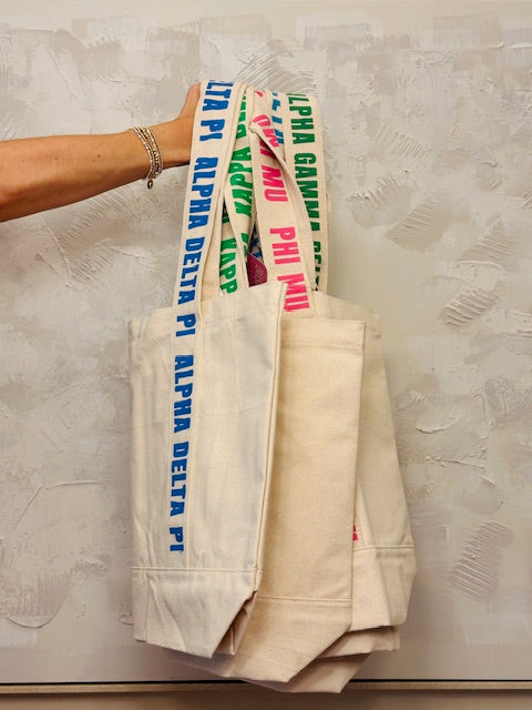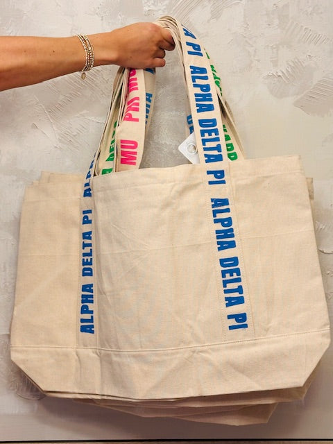 It measures 24"W x 14" H x 5"D with 10" drop handles and is made of 12oz heavy cotton canvas.