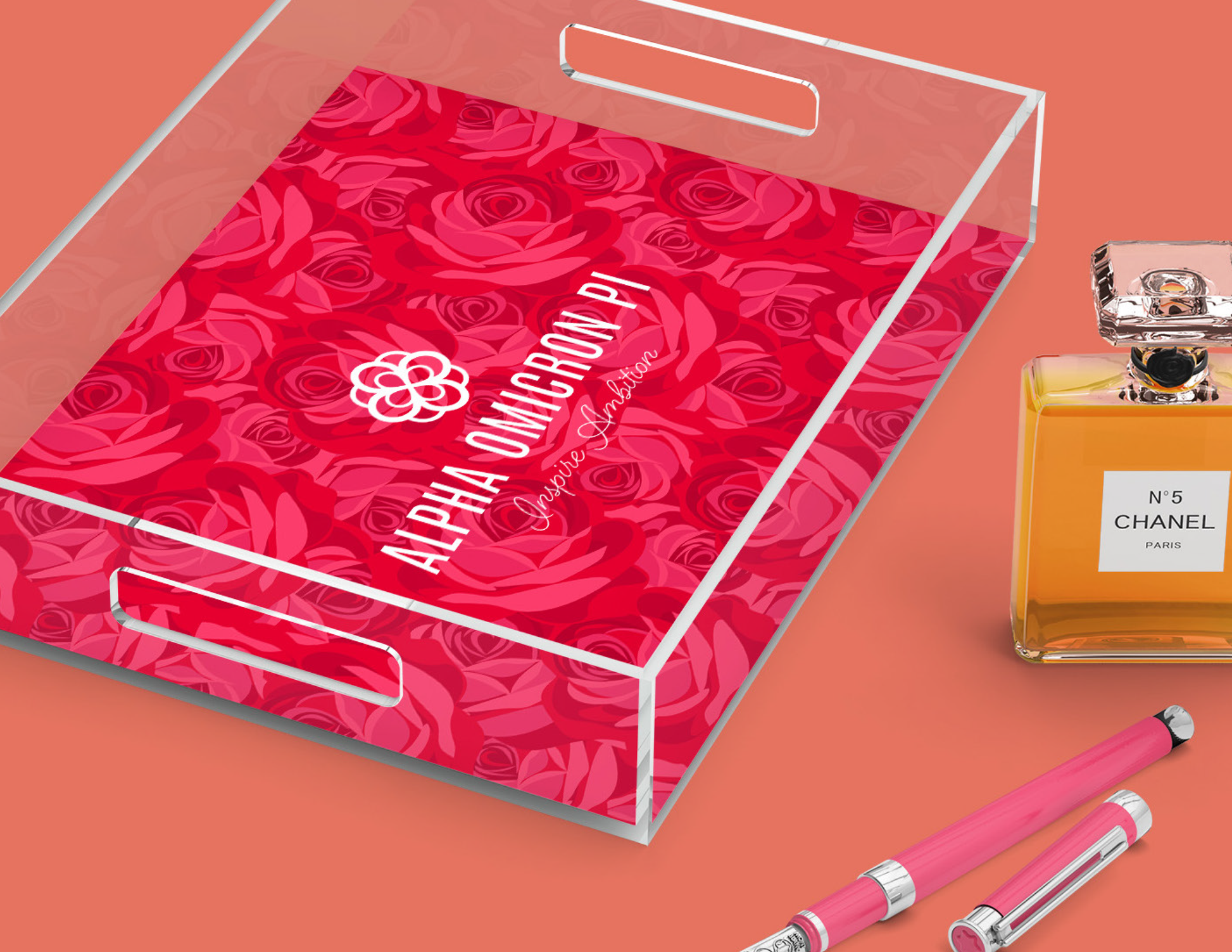 This decorative tray features the iconic Alpha Omicron Pi sorority logo, perfect for displaying or organizing small items. Crafted with high-quality materials, this tray adds a touch of sophistication and sisterhood to any room.