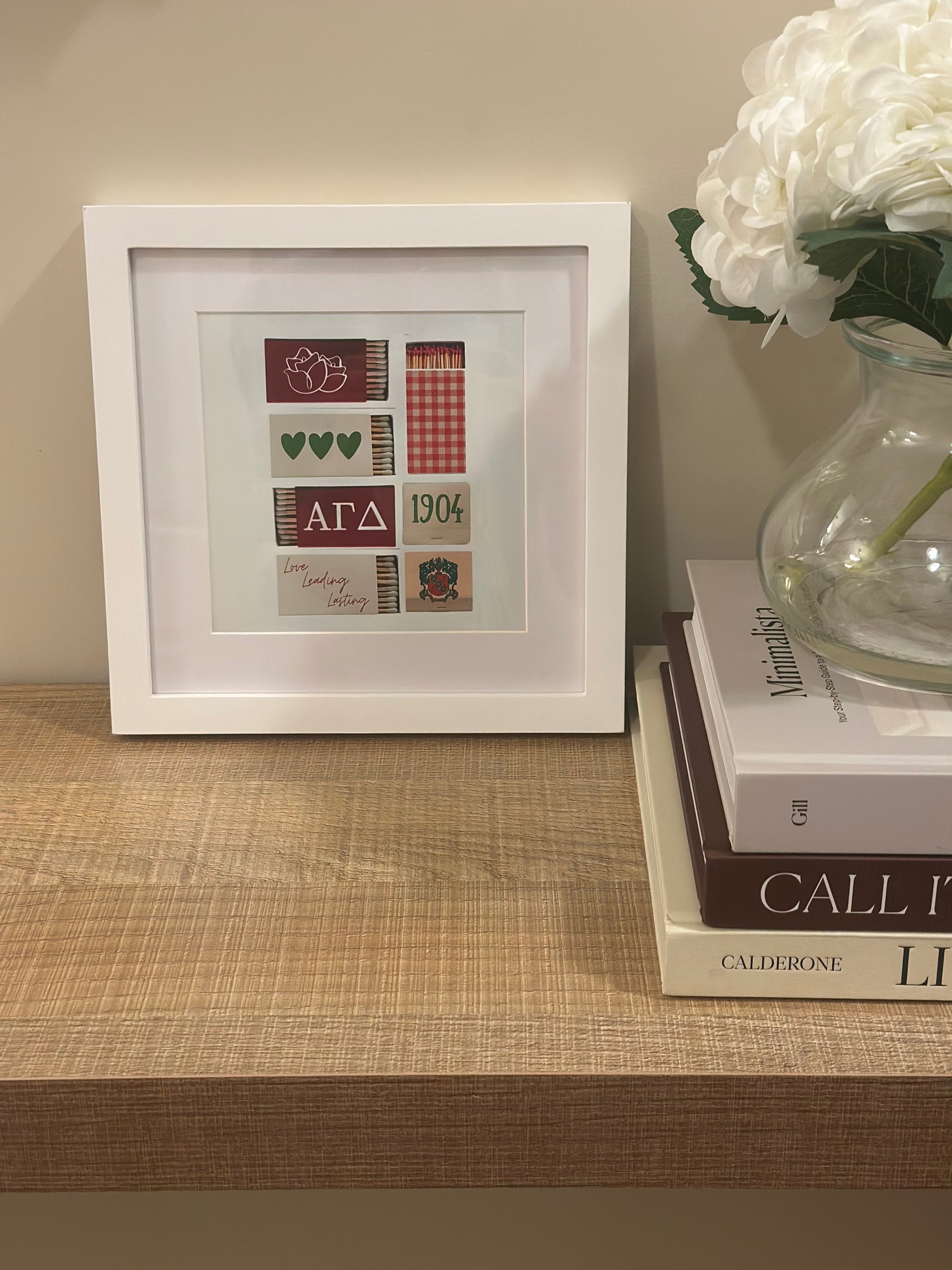 The Alpha Gamma Delta Matchbox Print features a distinctive 8x8 frame design that highlights the sorority’s iconic symbols with precision and clarity. Crafted for those who appreciate refined collegiate art, this print offers a balanced blend of tradition and modern aesthetics, making it an ideal piece for display in any Alpha Gamma Delta member’s collection or living space. Its compact size ensures versatility, while the expert design captures the essence of the sorority’s heritage.