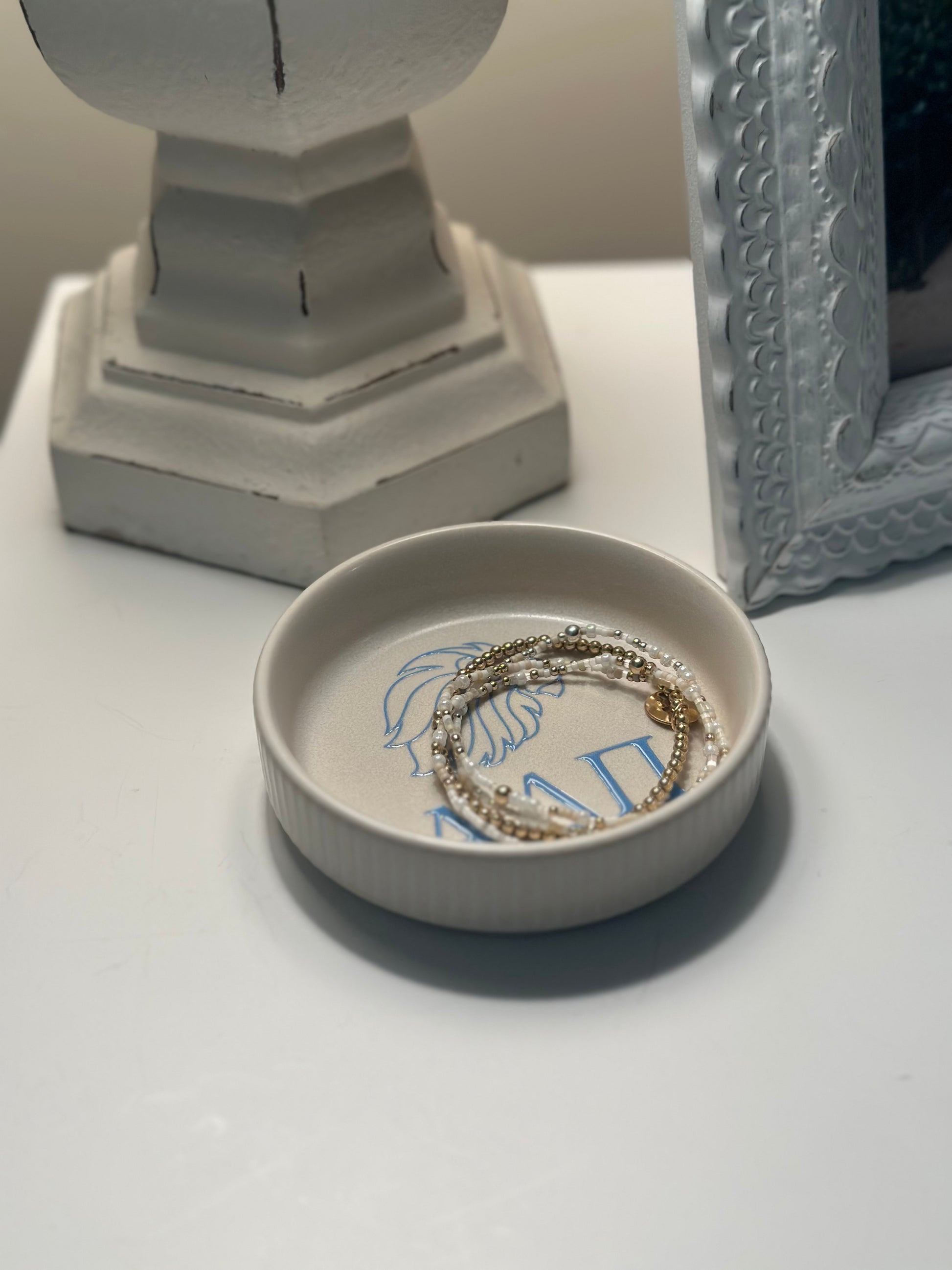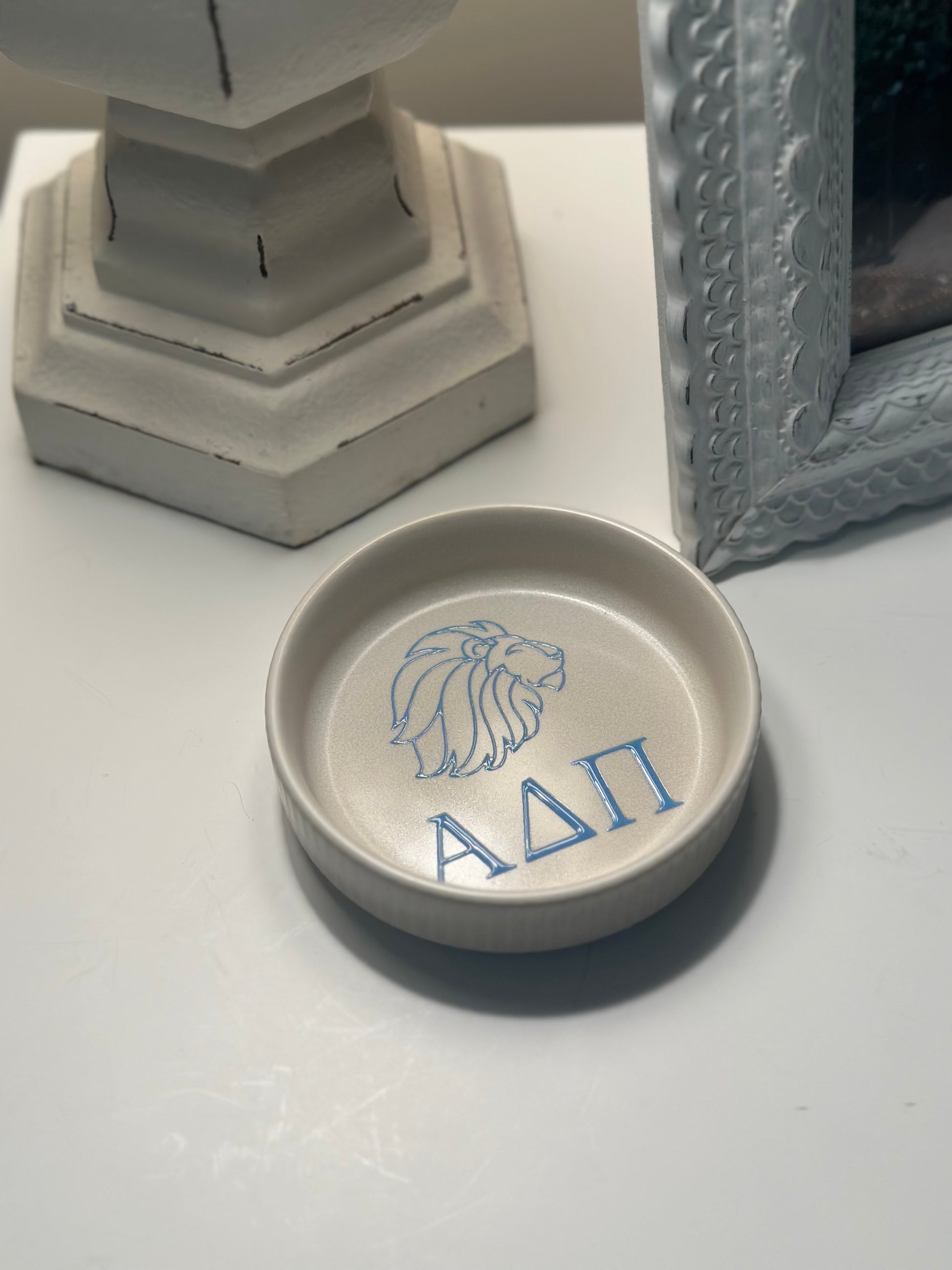 Introducing our Sorority Jewerly Dish, featuring your sorority's logo. Keep your bedside table or bathroom organized with this stylish and functional dish, designed specifically for your jewerly. Show off your sorority letters while keeping your accessories in one convenient place.