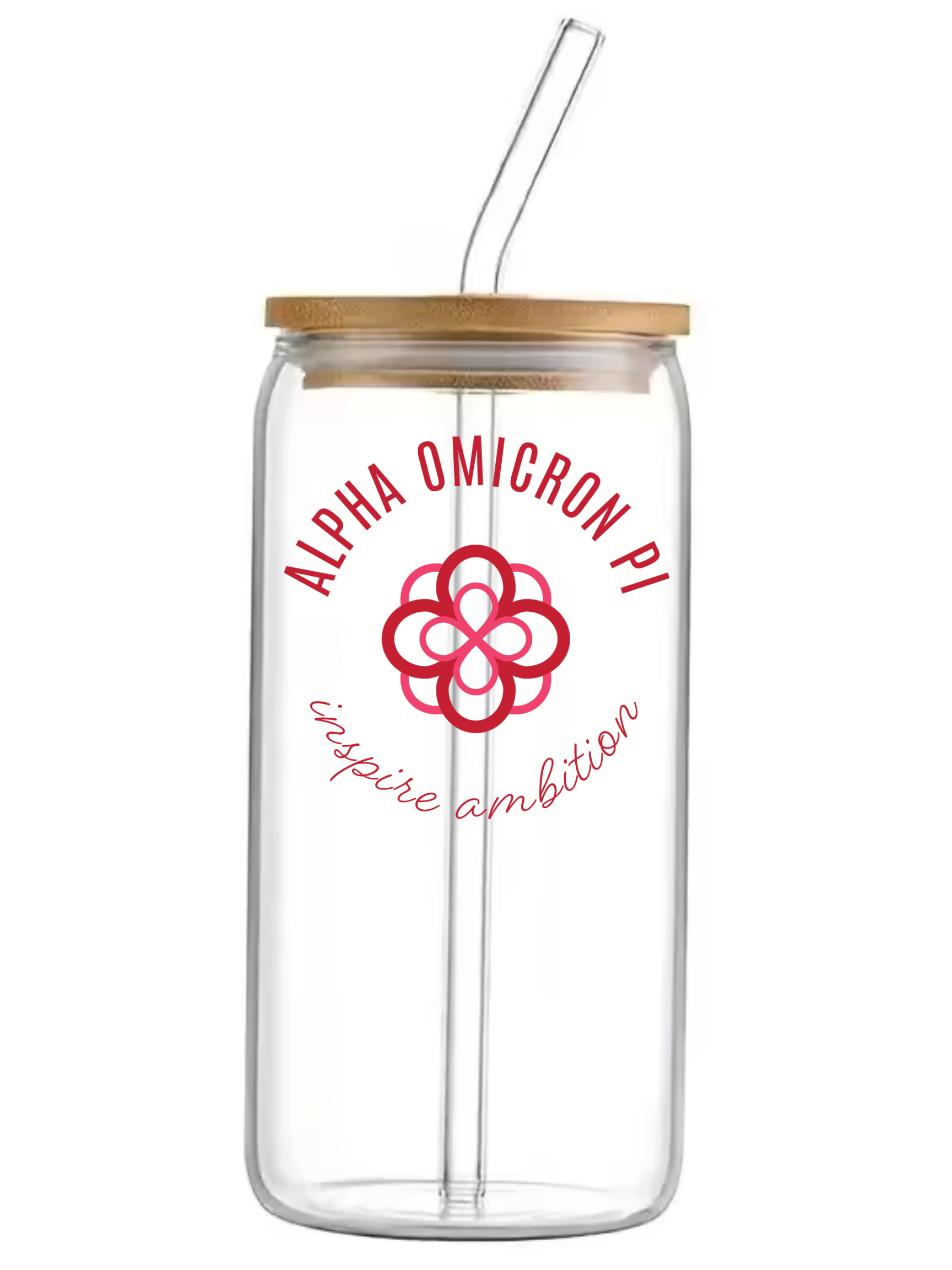 Introducing the Alpha Omicron Pi Glass Cup - the perfect accessory for any sorority member!