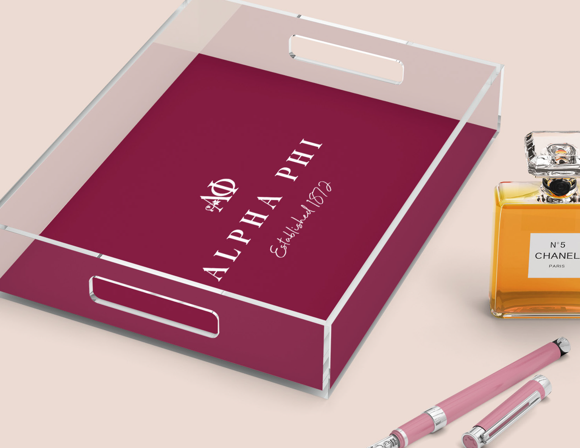 This decorative tray features the iconic Alpha Phi sorority logo, perfect for displaying or organizing small items. Crafted with high-quality materials, this tray adds a touch of sophistication and sisterhood to any room.