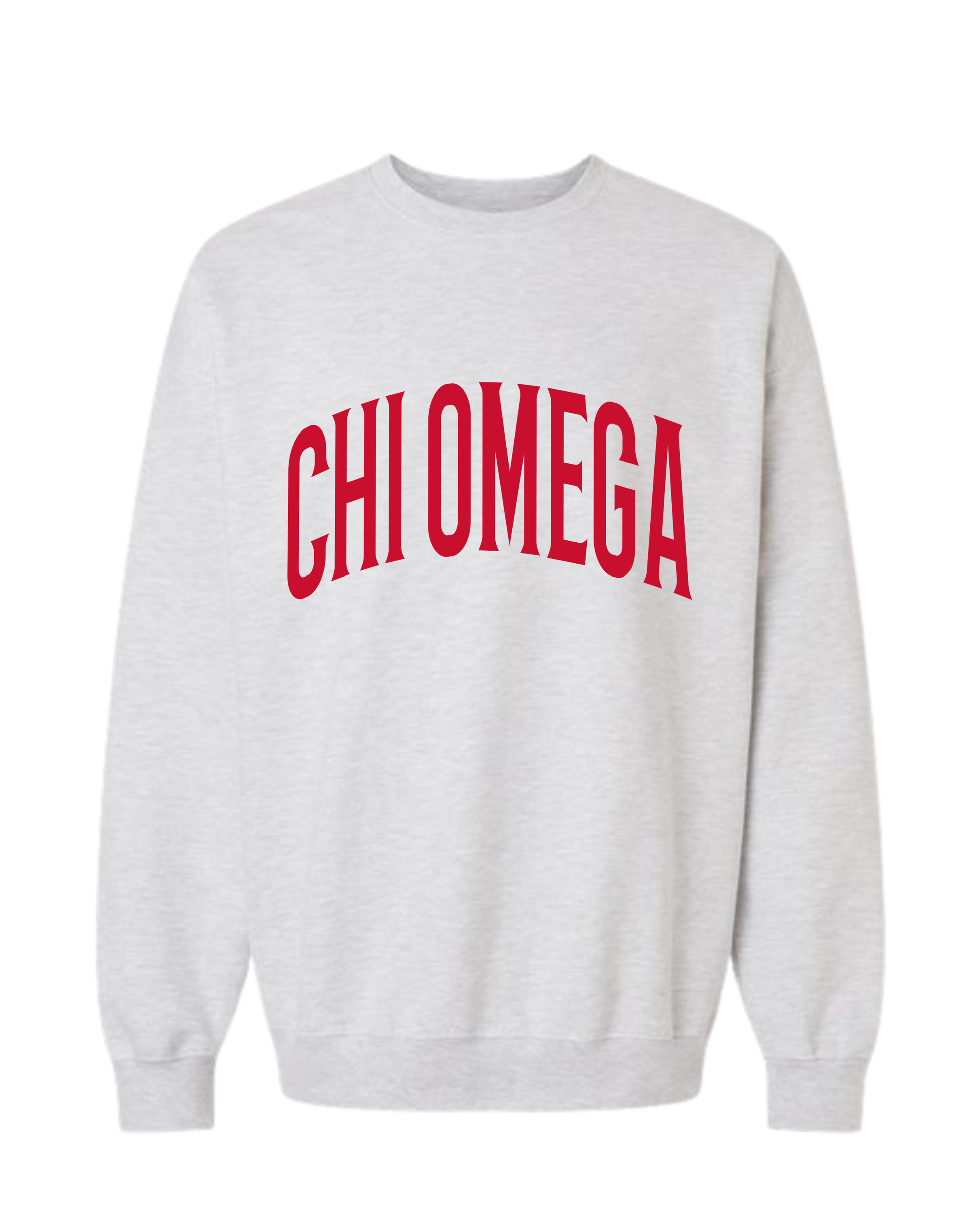 Your go to Chi Omega Fall sweatshirt is finally here in our classic Ash Grey color with a red design!