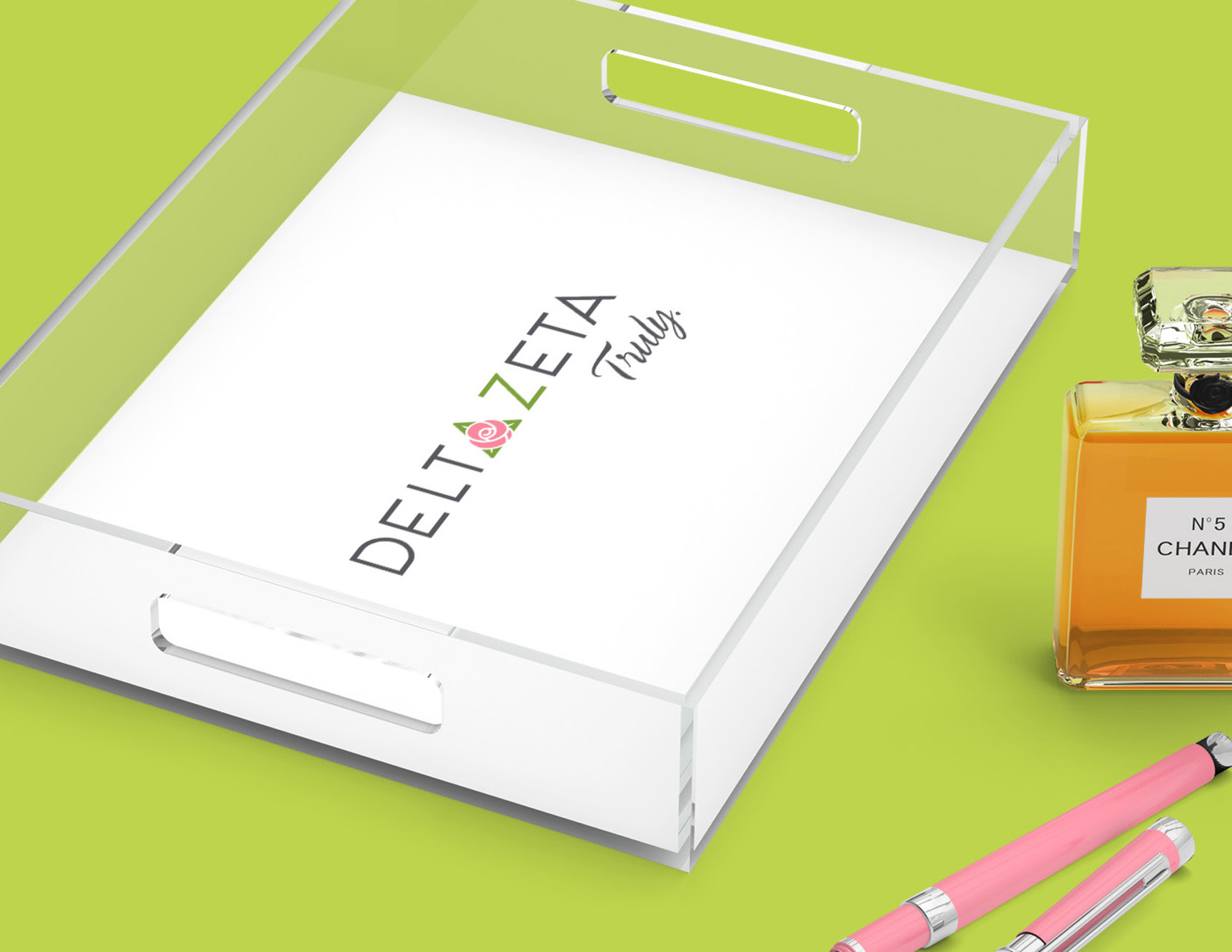 This decorative tray features the iconic Delta Zeta sorority logo, perfect for displaying or organizing small items. Crafted with high-quality materials, this tray adds a touch of sophistication and sisterhood to any room.
