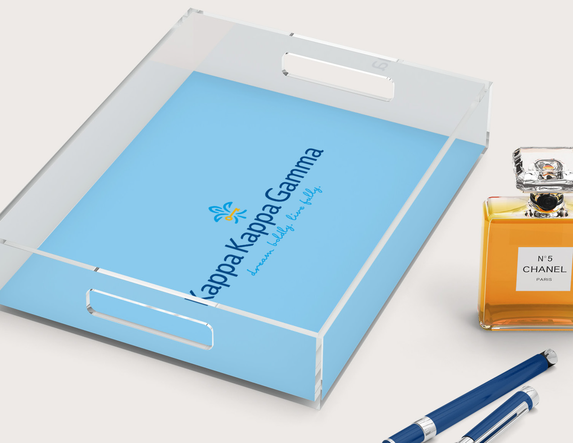 This decorative tray features the iconic Kappa Kappa Gamma sorority logo, perfect for displaying or organizing small items. Crafted with high-quality materials, this tray adds a touch of sophistication and sisterhood to any room.