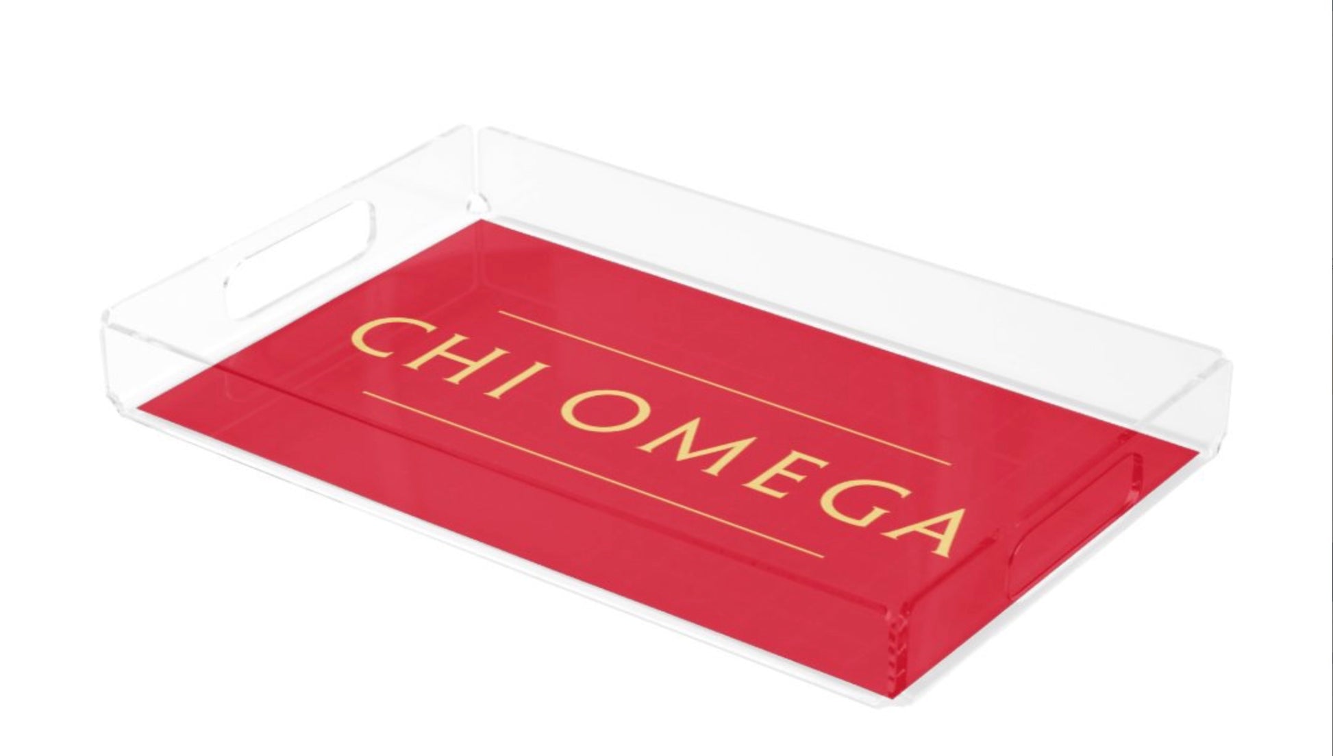 This decorative tray features the iconic Chi Omega sorority logo, perfect for displaying or organizing small items. Crafted with high-quality materials, this tray adds a touch of sophistication and sisterhood to any room.