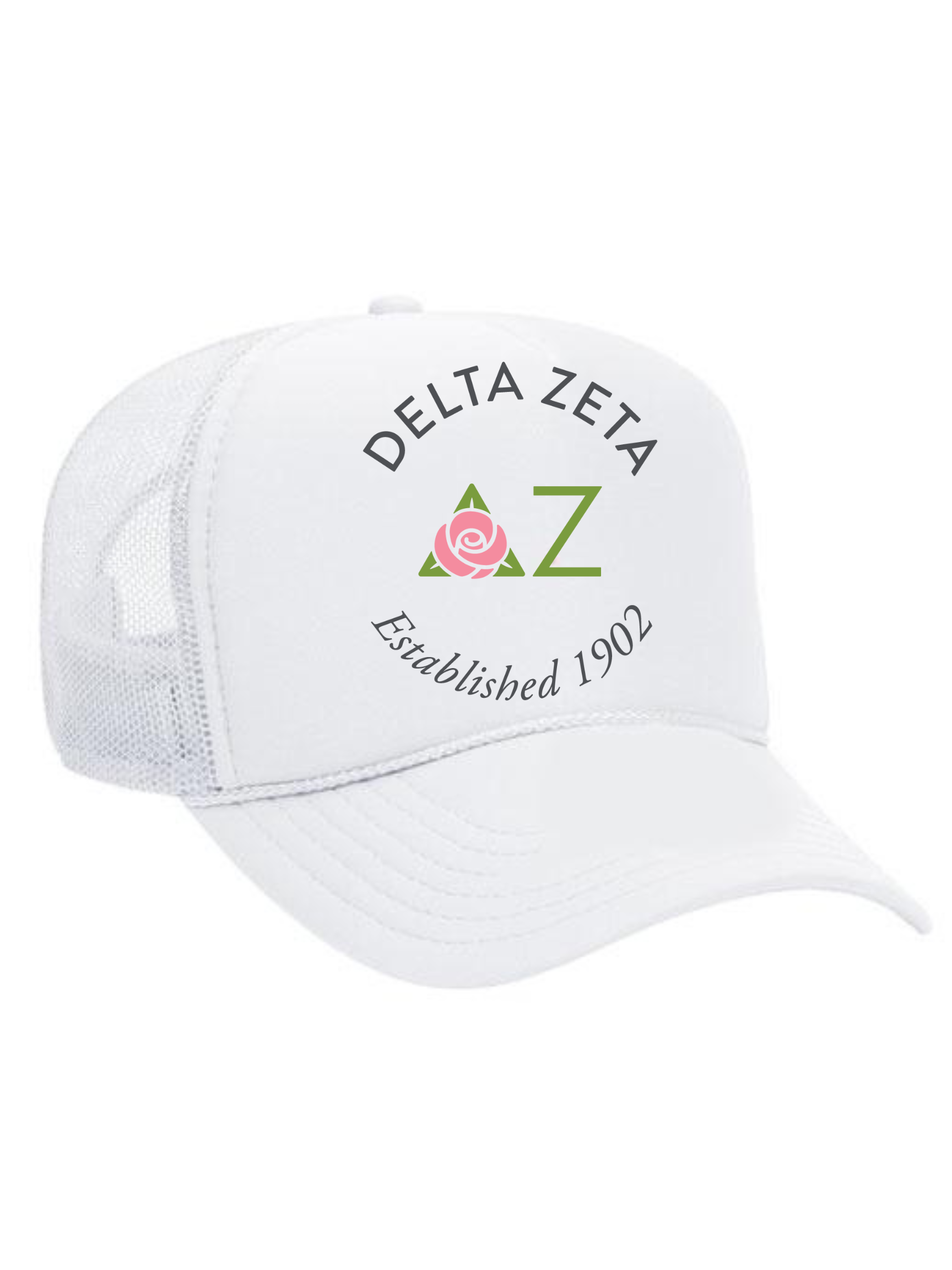 Introducing the Delta Zeta Trucker Hat - the perfect accessory for any sorority member. Made with high-quality materials, this trucker hat features a Delta Zeta logo, making it a must-have for all members.
