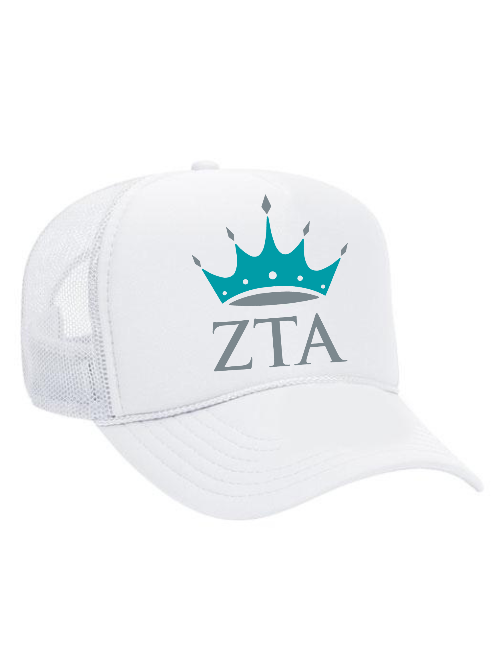 Introducing the Zeta Tau Alpha Trucker Hat - the perfect accessory for any sorority member. Made with high-quality materials, this trucker hat features a Zeta Tau Alpha logo, making it a must-have for all members.
