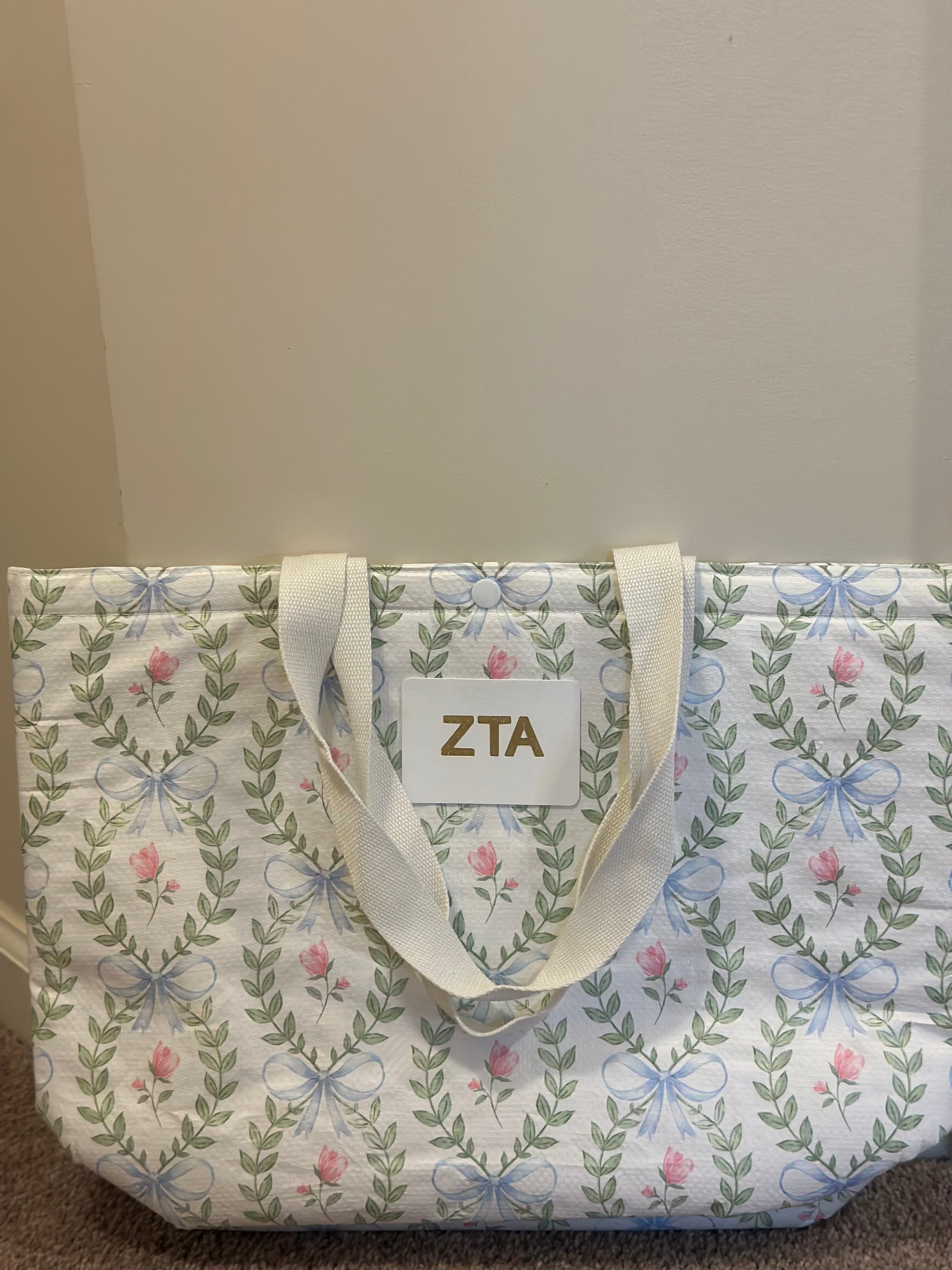 This exclusive Sorority Insulated Tote is both functional and appealing, adorned with your choice of Greek letters. Complete with a snap closure and white straps, this tote is a stylish must-have.