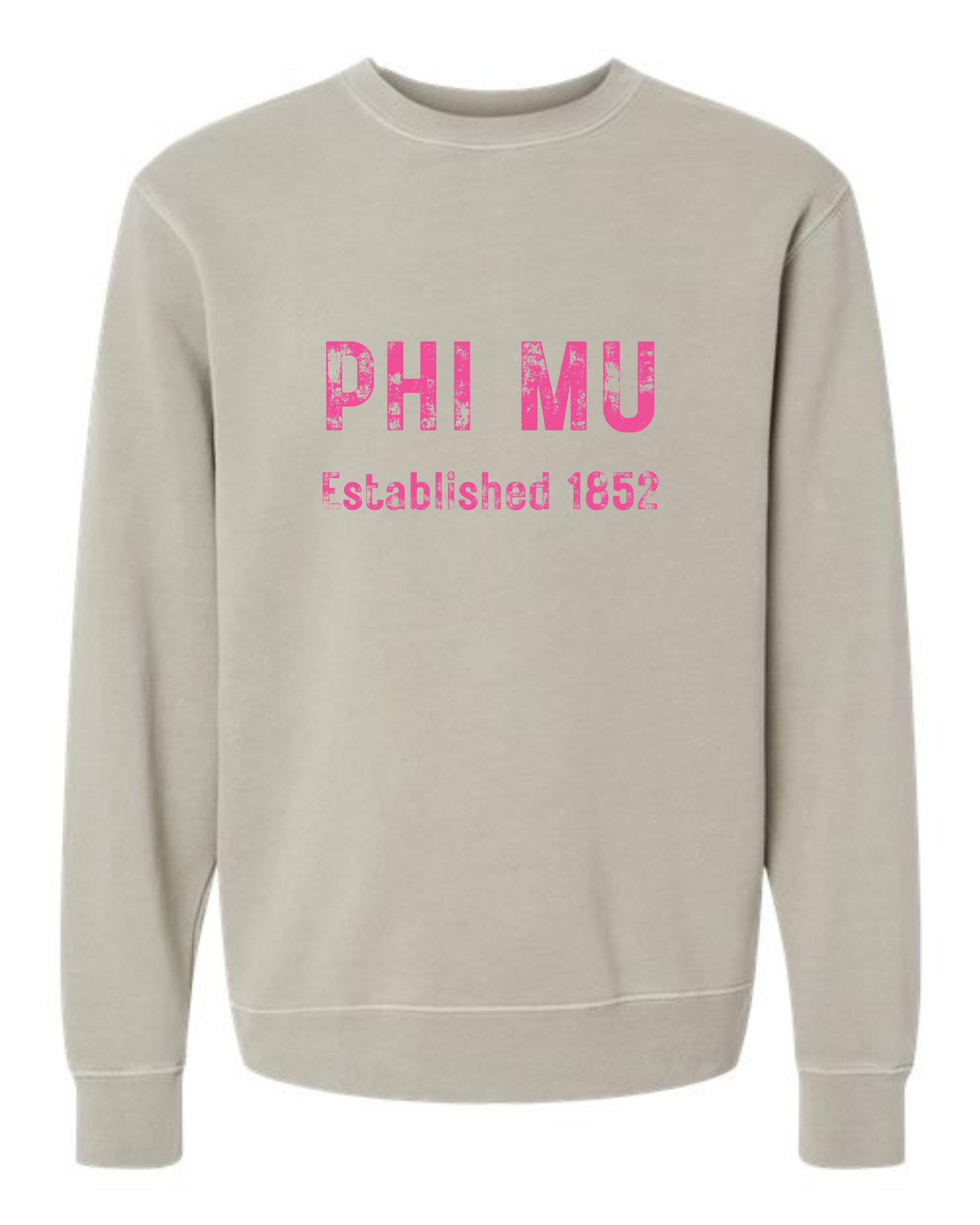 Stay warm and stylish with our Cement Color Phi Mu Established crewneck. Made with soft material this sweatshirt is perfect for showing off your sorority pride. Stay cozy while representing your sisterhood.