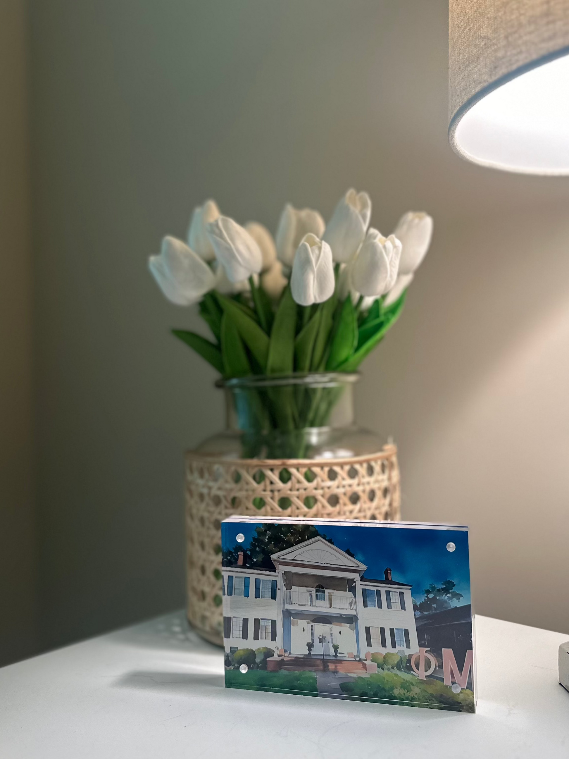 [Georgia College & State University] Add a splash of color to your living space with our Phi Mu Watercolor print framed in a beautiful acryrlic frame. This unique piece features a hand-painted watercolor image of your house, adding a touch of charm and personality. So why settle for a plain wall when you can make it pop with our one-of-a-kind print!