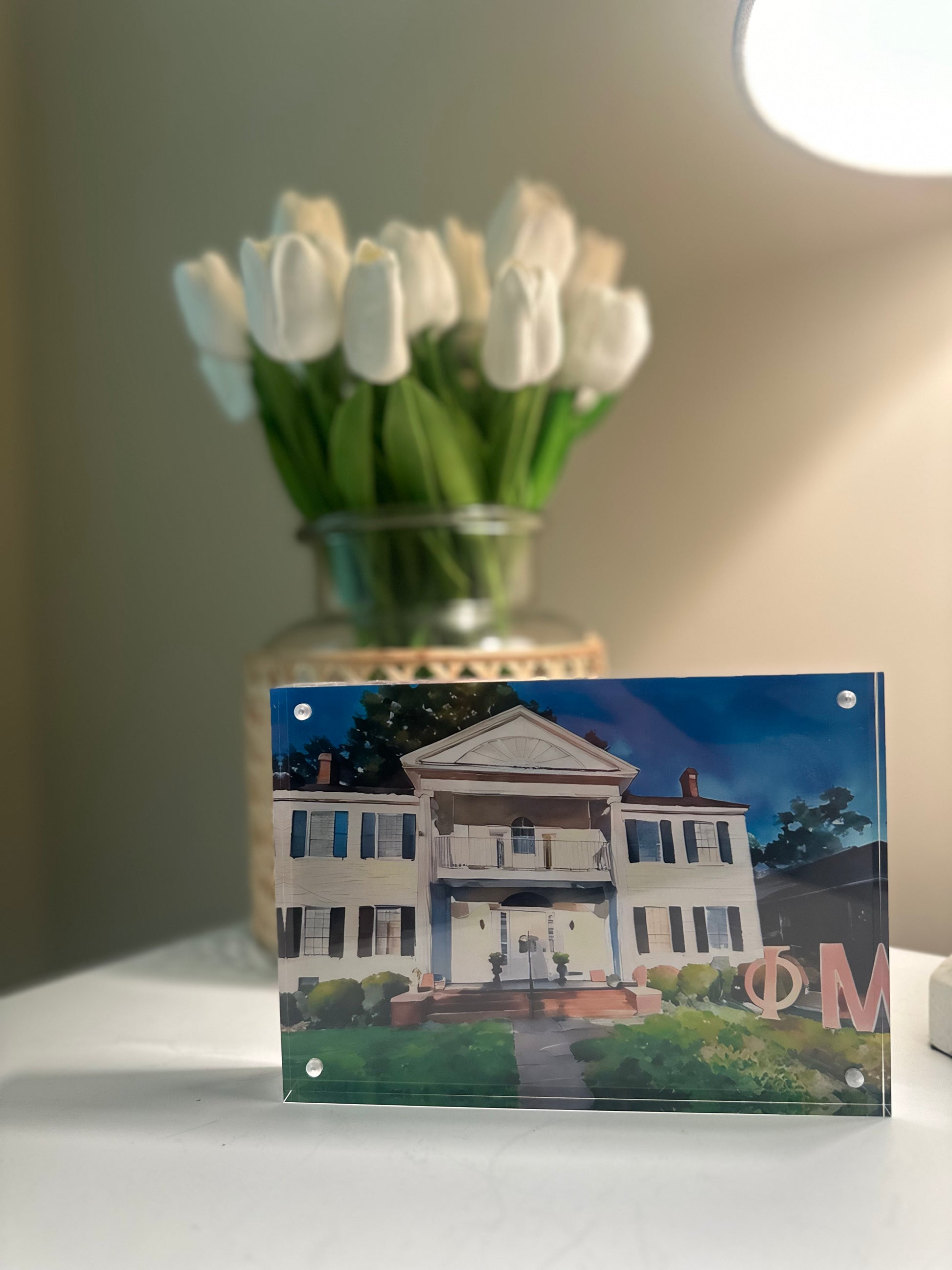 [Georgia College & State University] Add a splash of color to your living space with our Phi Mu Watercolor print in a beautiful acrylic frame. This unique piece features a hand-painted watercolor image of your house, adding a touch of charm and personality. So why settle for a plain wall when you can make it pop with our one-of-a-kind print!